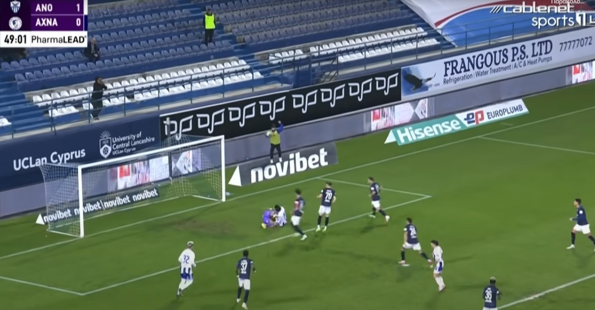Σε μια προσπάθεια του Μάριου Ηλία να κάνει την προβολή για να προλάβει τον Φλόρες και να σκοράρει,ο τερματοφύλακας του αντιπάλου κλωτσά εσκεμμένα και με πρόθεση τον επιθετικό της ομάδας μας στο στήθος.